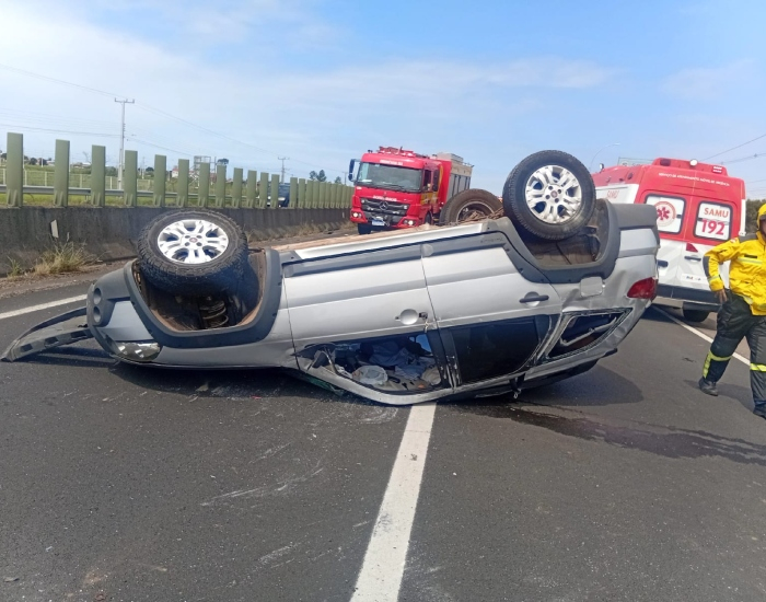CBMSC/Divulgação/Folha Regional Um veículo Fiat Palio capotou na BR-101, no Km 433, no município de Sombrio, neste domingo, dia 1º. Quatro pessoas estavam no veículo.