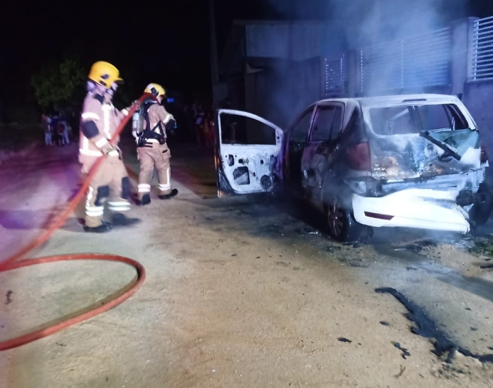 BVJ/Divulgação/Folha Regional Um veículo VW Fox com placas de Tubarão foi destruído por um incêndio na noite desta quarta-feira, dia 13. O incêndio foi registrado na Rua Plínio Schmitz, no bairro Paulo Cruz, em Jaguaruna.