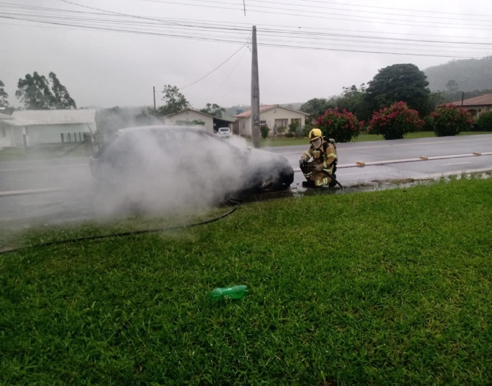 A guarnição dos Bombeiros Voluntários foi acionada para combater o fogo e ao chegar no local, se deparou com o carro tomado pelas chamas.
