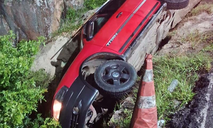 Foto: Divulgação Um carro saiu da pista na noite de sábado (7) na rua Luiz Severino Duarte, conhecida como a via das Curvas do Iró, em Laguna. Havia três pessoas no veículo.