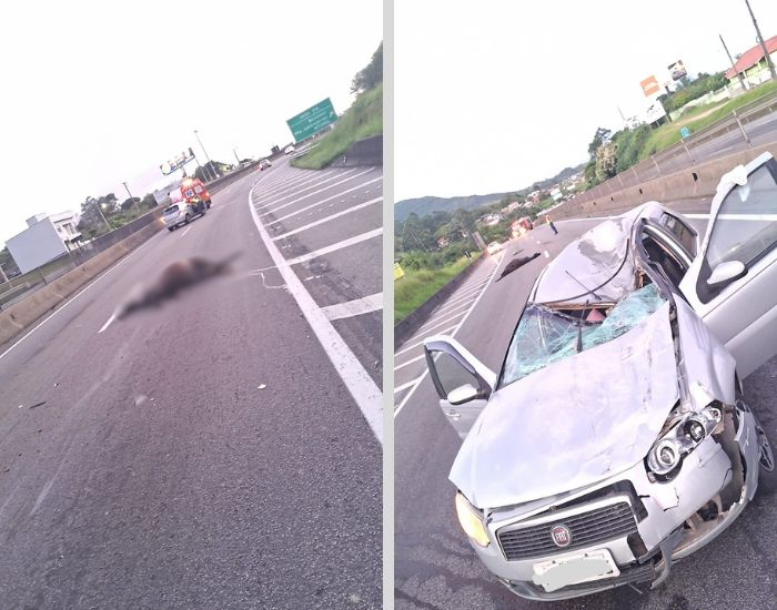 De acordo com o Corpo de Bombeiros Militar de Laguna, um veículo Fiat Palio atingiu um cavalo que estava solto na pista. Com o impacto, o animal morreu no local e ficou caído sobre a faixa de rolamento da esquerda. O carro parou alguns metros à frente, na faixa da direita.