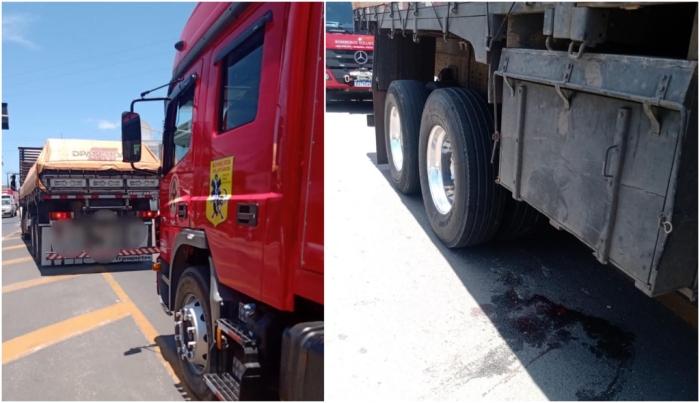 A vítima foi encontrada com as pernas pressionadas pela bicicleta que ficou presa embaixo da roda do caminhão e foi encaminhada ao hospital