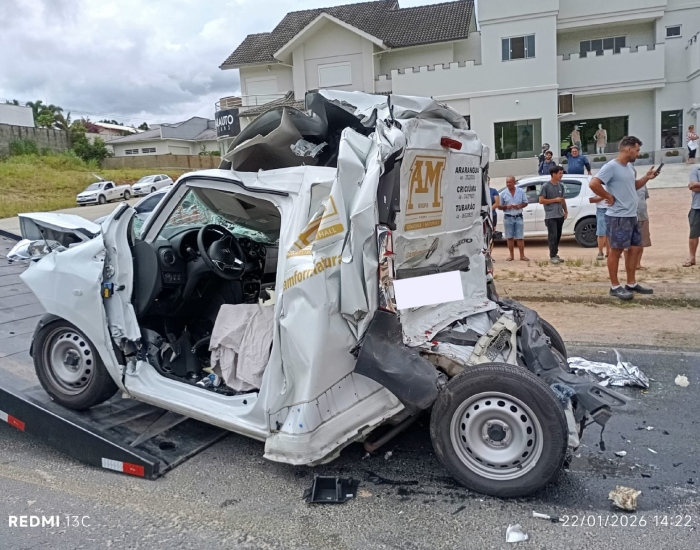Corpo de Bombeiros, Samu e Polícia Militar Rodoviária (PMRv) foram acionados e constataram a colisão entre um caminhão Mercedes Bens e um veículo Renault Kangoo. Com o impacto, o carro ficou prensado.