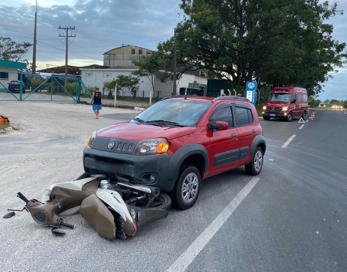 Uma jovem de 19 anos sofreu ferimentos ao se envolver em uma colisão entre um veículo Fiat Uno com placas de Braço do Norte e uma motocicleta Honda Biz com placas de Tubarão.