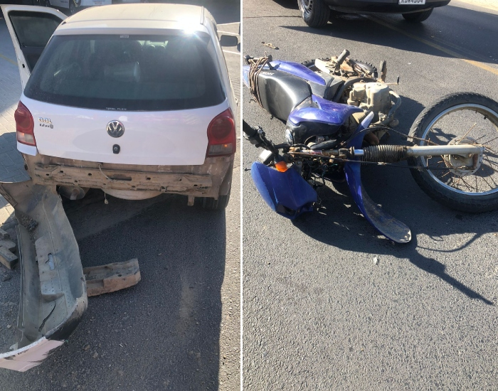 Trata-se de uma colisão lateral entre um carro e uma motocicleta. A guarnição dos Bombeiros Voluntários encontrou o condutor da moto com sangramento nasal, ferimentos pelo corpo e suspeita de fraturas.
