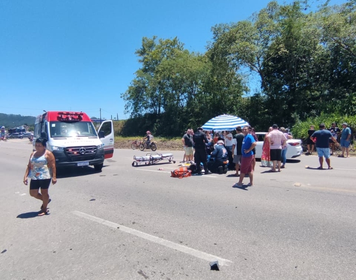 O Corpo de Bombeiros foi acionado junto com a equipe do serviço aeromédico Saer/Samu e encontraram a motociclista, de 32 anos, consciente, e referindo muita dor, com suspeita de fratura e traumatismo cranioencefálico (TCE). Segundo os atendentes, ela conduzia a moto quando o carro cortou a frente e colidiu.