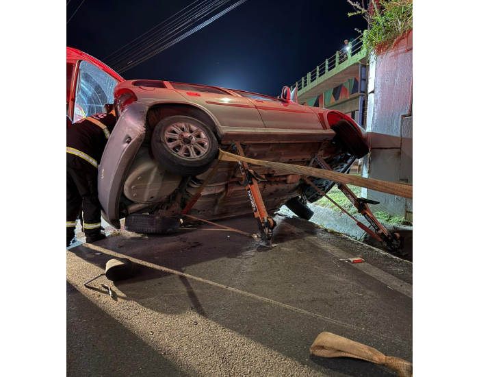A primeira equipe a chegar à cena foi a guarnição da Polícia Rodoviária Estadual (PRE), a qual, ao constatar o risco de tombamento do veículo, realizou a ancoragem do mesmo à própria viatura, utilizando fita de tração.