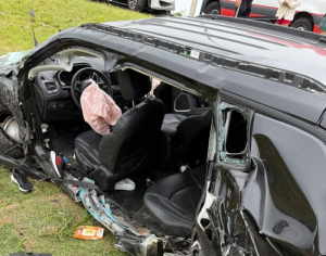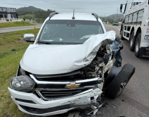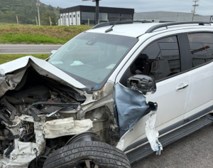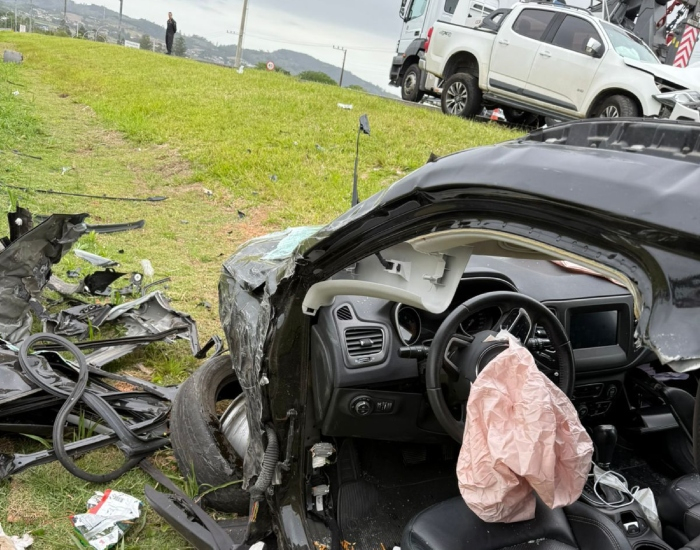 BVJ/Divulgação/Folha Regional Um grave acidente de trânsito mobilizou os socorristas na BR-101, no Km 352, no Morro Azul, em Jaguaruna, neste domingo, dia 26. Dois automóveis, um Jeep e uma caminhonete S-10 colidiram frontalmente na rodovia.