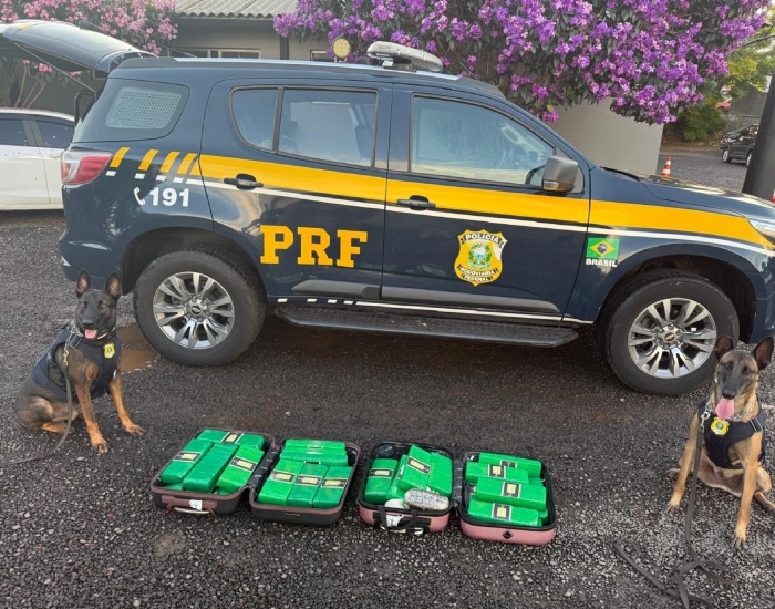 Durante abordagem a um ônibus, os cães farejadores da PRF identificaram duas bagagens suspeitas no compartimento de carga. A verificação revelou que as malas pertenciam a um passageiro de 26 anos, com mandado de prisão em aberto. Nas bagagens, foram encontrados quase 27 kg de maconha, além de 1 kg de haxixe e 100 g de skank.