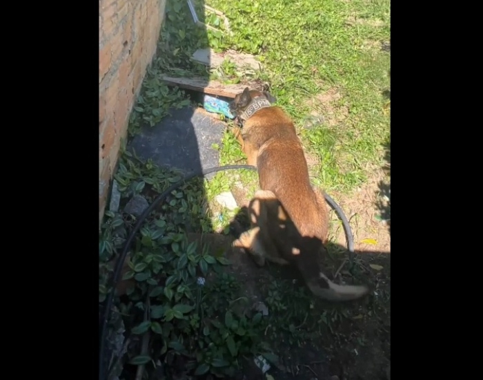 No exato local informado pela AI, os militares, com o auxílio do cão de faro, encontraram e apreenderam três quilos de maconha que estavam embalados e escondidos em um terreno.