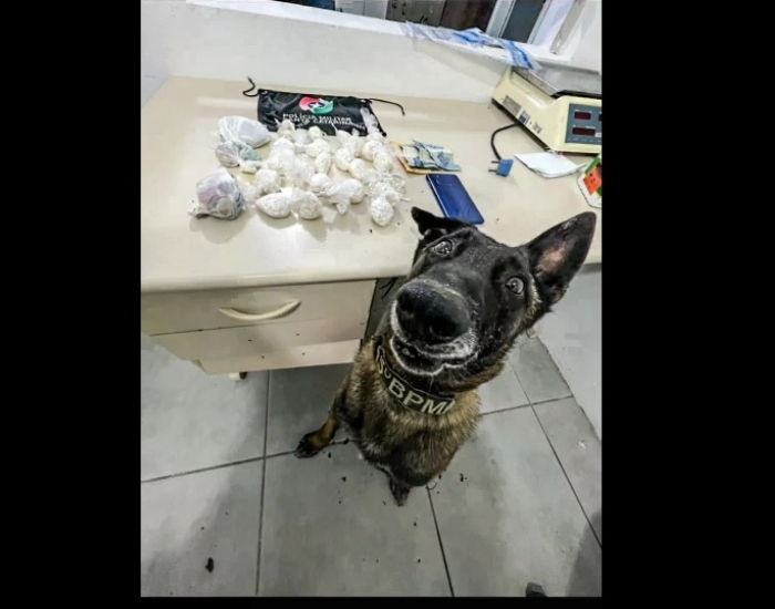 Em busca pessoal, nada de ilícito foi encontrado, porém com o apoio do Canil, o cão de faro encontrou embaixo de uma pedra, um pacote com maconha (118.8 gramas), e próximo ao local, mais 20 pacotes de crack contendo aproximadamente 2.300 pedras (201.5 gramas).