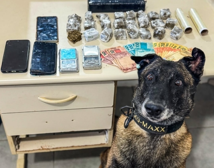 Seguindo as buscas, o cão policial encontrou mais um torrão único contendo aproximadamente 600 gramas de maconha no forro da residência. No local estavam mais dois homens de 25 e 24 anos e uma mulher de 35 anos. Também foram encontradas duas balanças de precisão, material para embalagem, celulares, além de R$ 570 em dinheiro.