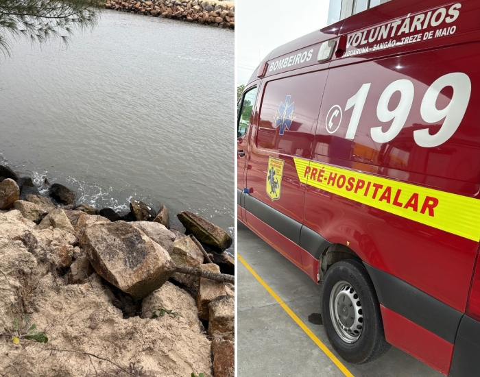 BVJ/Divulgação/Folha Regional Uma criança de 11 anos teve as pernas prensadas ao escorregar de uma pedra às margens da Barra do Camacho, em Jaguaruna, neste sábado, dia 22.