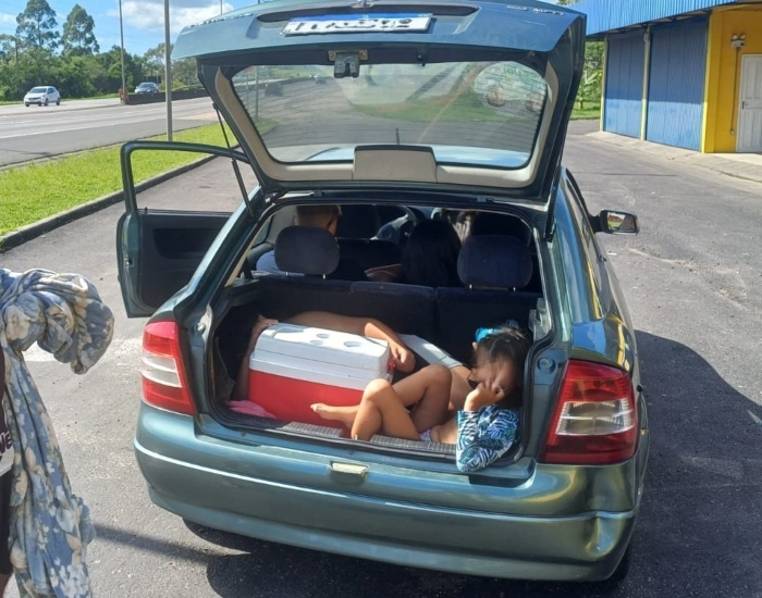 O motorista, morador de Palhoça, disse que estava levando a esposa e cinco filhos para passar o dia em uma praia de Imbituba. Como não havia espaço para todos, as duas crianças de 8 e 11 anos foram parar no porta-malas, disputando espaço com sacolas e uma caixa térmica.