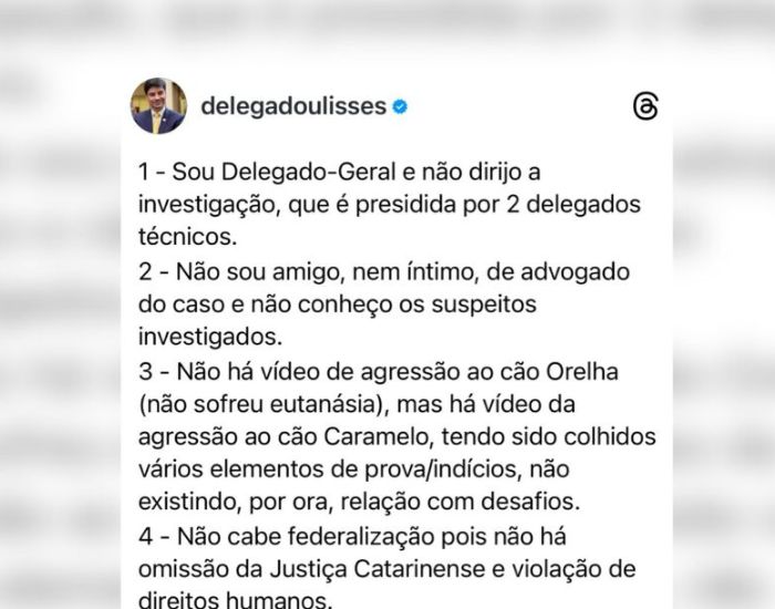 Em manifestação publicada nas redes sociais, o delegado-geral da Polícia Civil de Santa Catarina, Ulisses Gabriel, reforçou que o caso não se enquadra nos critérios legais para federalização.