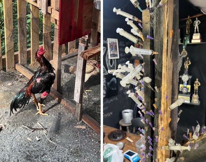 No interior da academia foram encontradas seringas usadas e galos com feridas expostas usados em rinhas