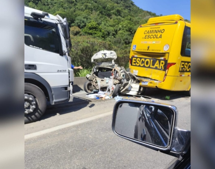Acidente envolveu dois carros, um micro-ônibus escolar e uma carreta no trecho entre Paulo Lopes e Garopaba