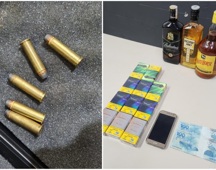 Com esses, foram apreendidos R$200,00 em espécie, carteiras de cigarros, 3 garrafas de whisky e 5 munições de revólver calibre .357. Diante dos fatos, foi dada voz de prisão aos envolvidos e conduzidos até a Delegacia de Polícia.