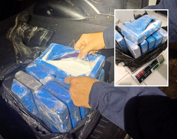 Durante a fiscalização, os policiais encontraram, dentro de um saco plástico no porta-malas, 12 quilos da droga divididos em tabletes.