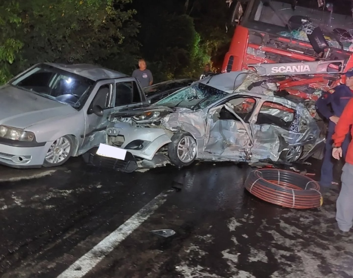 Grave acidente envolveu cinco automóveis e uma carreta causando a interdição da pista