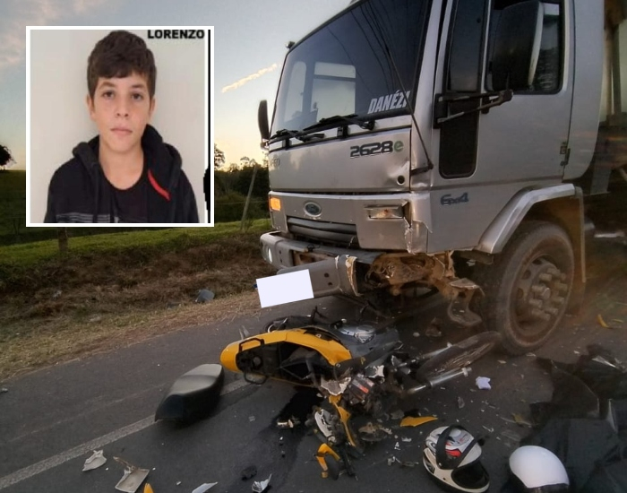 Lorenzo Piva Nogueira estava em uma motocicleta com sua mãe quando se envolveram em uma colisão contra um caminhão