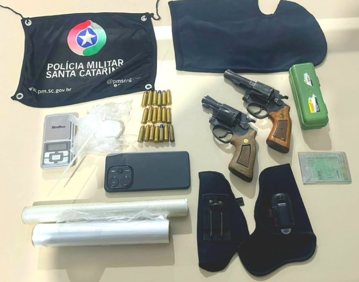 Ainda no local foi encontrada uma mochila contendo dois revólveres calibre 38, sendo um com numeração suprimida, além de 19 munições intactas do mesmo calibre.
