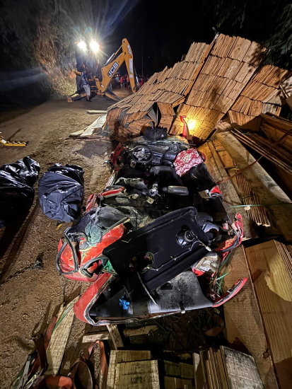 A ocorrência envolveu a colisão e o posterior tombamento de um caminhão Scania, carregado com tábuas de madeira, sobre um automóvel de passeio.