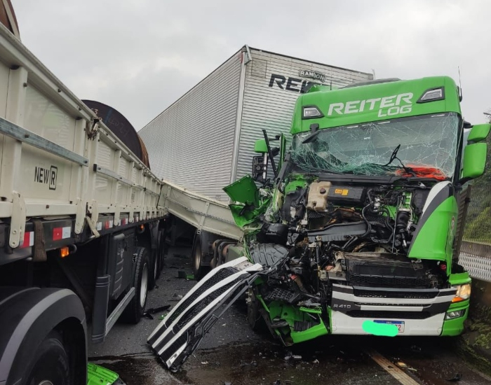 Divulgação/Folha Regional Uma colisão entre duas carretas interditou a BR-101 no Km 29,8 em Joinville, sentido norte, na manhã desta quarta-feira, dia 20. O acidente não teve vítimas, mas destruiu a frente dos veículos.