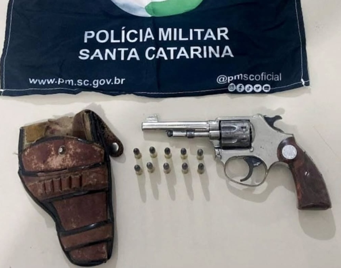 PMSC/Divulgação/Folha Regional Um homem de 60 anos foi conduzido à delegacia por porte ilegal de arma de fogo após fazer ameaças contra a vizinha de sua ex-esposa. O fato ocorreu na noite desta segunda-feira, dia 3, no Centro da cidade de Grão-Pará.