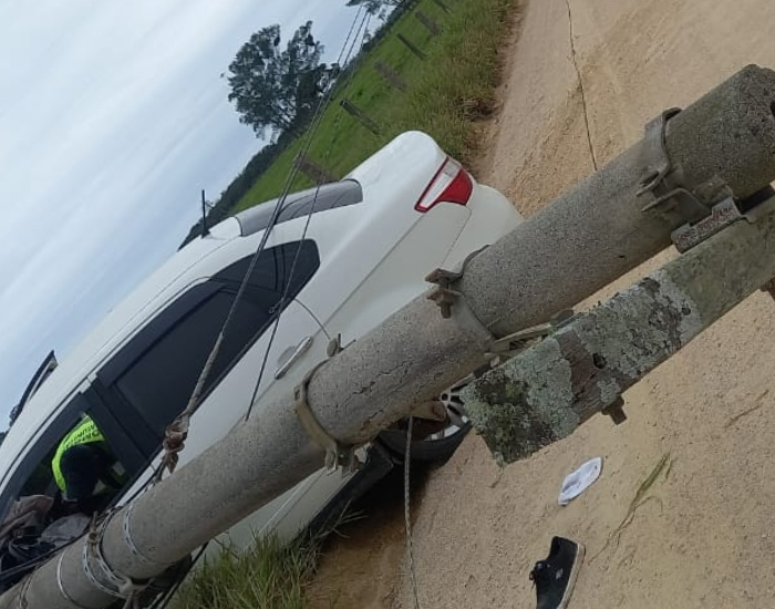 O condutor do veículo Fiat Siena colidiu seu veículo contra um poste. Com o impacto, o poste quebrou e caiu e a fiação elétrica ficou sobre a via.