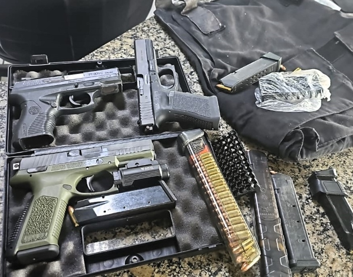 No assoalho do banco da frente, os policiais encontraram uma mochila contendo as três armas. Duas das pistolas estavam com a numeração de série raspada. Todas estavam prontas para uso, com carregadores municiados.