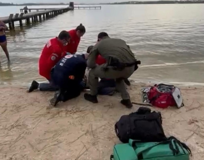 Segundo a equipe do serviço aeromédico (Saer), o homem pulou de ponta cabeça de um trapiche para dentro da lagoa e colidiu contra o fundo. Com o trauma, ele foi socorrido e apresentou sinais de lesão na coluna.