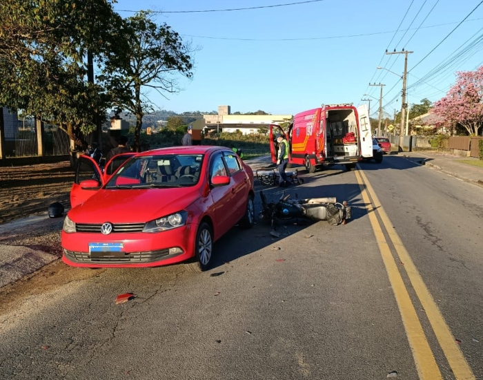 CBMSC/Divulgação/Folha Regional Uma colisão entre um carro e uma moto foi registrada na manhã desta quarta-feira, dia 10, na localidade de Estação Cocal, em Morro da Fumaça. O Corpo de Bombeiros foi acionado na Rua João de Rochi para atender a ocorrência.