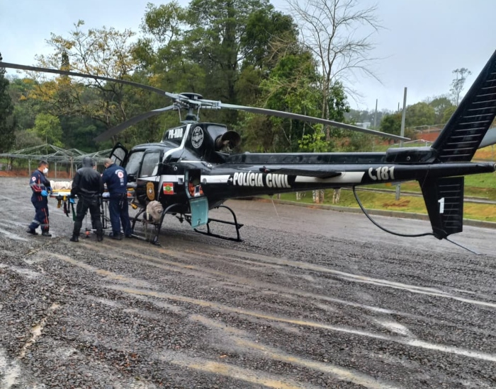 O paciente foi estabilizado e conduzido de helicóptero até o Hospital São José em Criciúma para realização de exame de tomografia de crânio e seguimento.