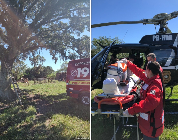 BVJ/Divulgação/Folha Regional Um senhor de 87 anos sofreu graves ferimentos neste domingo, dia 21, após cair de uma árvore de aproximadamente quatro metros de altura. O acidente ocorreu na Estrada Geral do Retiro, em Jaguaruna.