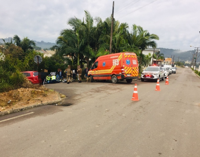 O Corpo de Bombeiros de Morro da Fumaça foi acionado para atender a ocorrência. Ao chegar no local, encontrou o condutor da motocicleta, um senhor de 83 anos, sobre a via pública em decúbito lateral esquerdo, já sem capacete, consciente, orientado, sinais vitais normais. Ele apresentou suspeita de luxação em membro inferior esquerdo (região do osso patela) e escoriações na mão esquerda.