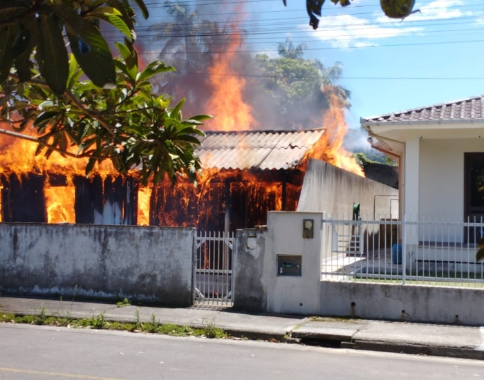 Divulgação/Folha Regional Um incêndio destruiu uma residência de madeira no bairro Fiorita, em Siderópolis, nesta quarta-feira, dia 7.