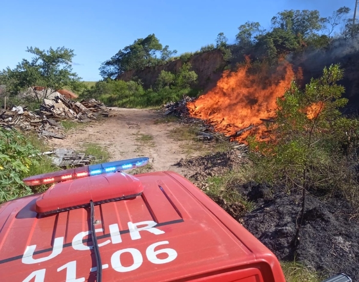 Por volta das 16h a guarnição chegou no local e deparou com fogo no pátio de uma cerâmica em um estoque de lenha.
