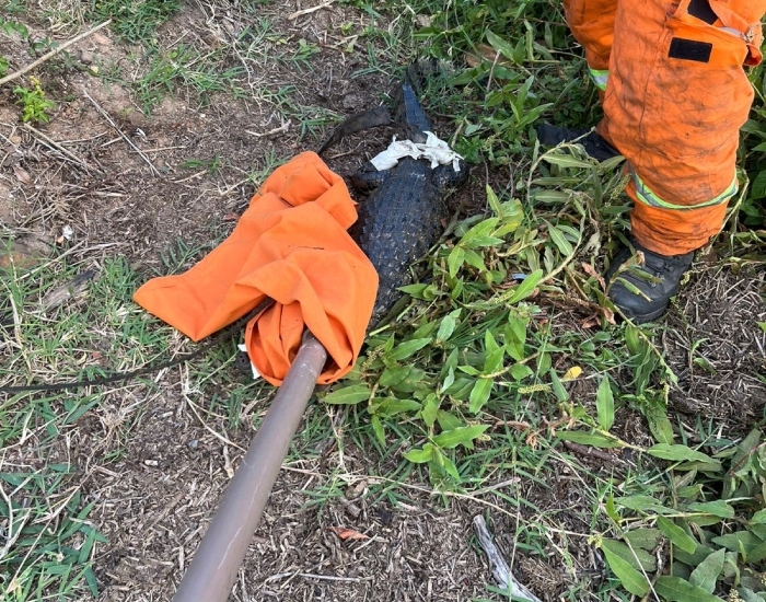 BVJ/Divulgação/Folha Regional Um jacaré chamou a atenção de moradores ao ser visto em um córrego no Balneário Garopaba do Sul, em Jaguaruna, nesta terça-feira, dia 14.