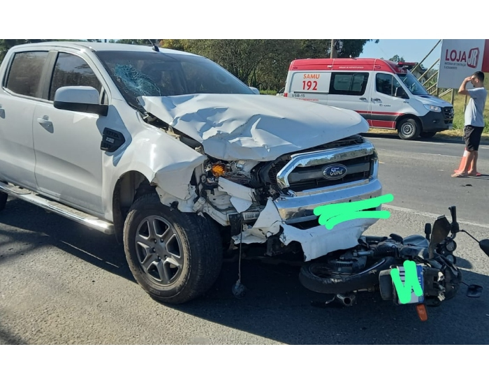 Uma colisão entre um carro e uma motocicleta deixou uma jovem de 20 anos gravemente ferida na tarde deste sábado, dia 10. O acidente ocorreu na SC-445, no bairro Lombas Pedreiras, em Içara envolvendo uma caminhonete Ford Ranger e uma moto Honda CG.