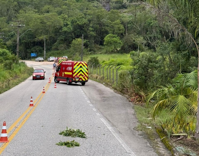 Os Bombeiros Voluntários foram acionados e encontraram o condutor da moto, um jovem de 22 anos, com escoriações pelo corpo.
