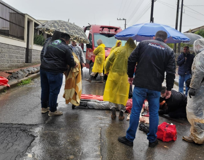 Os Bombeiros Voluntários foram acionados e encontraram a vítima com dor nos arcos costais, escoriações, corte contuso na cabeça região occipital e ferimento em face.