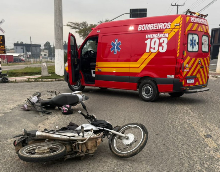 Foto: Divulgação/CBMSC Um jovem, de 23 anos, e uma idosa, de 62 anos, ficaram feridos após um acidente de trânsito envolvendo duas motocicletas. O fato foi registrado na avenida Celeste Recco, no bairro Jussara, em Morro da Fumaça. A guarnição do Corpo de Bombeiros Militar foi chamada pela central para atender a ocorrência.