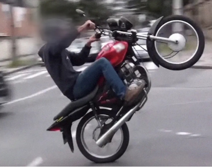 Durante rondas, a polícia avistou o motociclista trafegando de forma perigosa, equilibrando-se em apenas uma das rodas do veículo, colocando em risco a própria integridade física e a de terceiros.