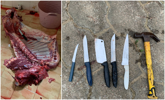 Na ocasião, o denunciado foi flagrado enquanto terminava de carnear o animal. Um dos enteados também o ajudava nessa tarefa. Como “abatedouro” improvisado, a casa estava repleta de sangue e com pedaços de carne espalhados sob a mesa da cozinha. A companheira do réu igualmente se fazia presente no local e, embora não tivesse participado do roubo do animal, dolosamente agiu para ocultar o animal já abatido dentro de sua residência. Ao todo, foram recuperados cerca de 150 quilos de carne bovina.
