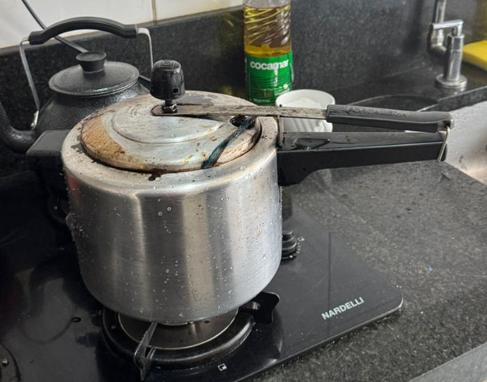 A guarnição entrou no imóvel, utilizando a chave fornecida pelo proprietário, e identificou que a origem da fumaça era uma panela de pressão esquecida no fogão. O utensílio foi imediatamente retirado e resfriado em local seguro.