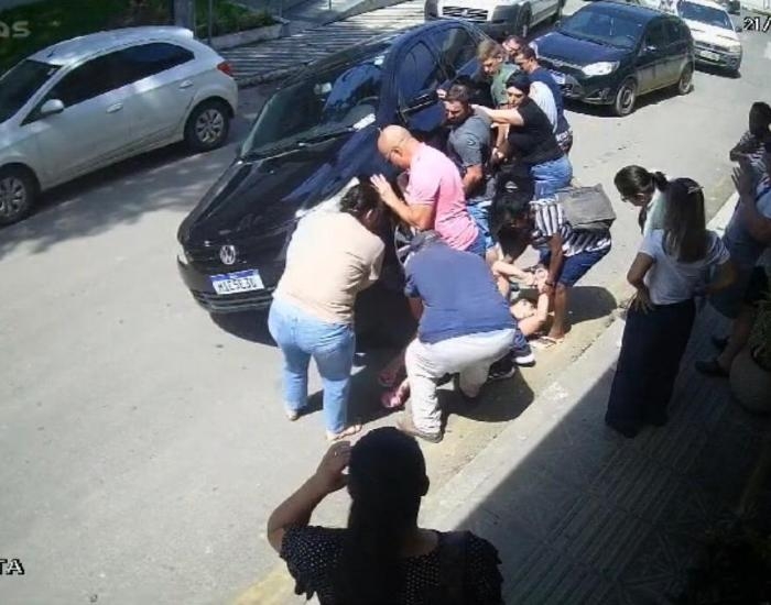 Um vídeo que circula nas redes sociais mostra o momento em que a idosa é atingida e vai parar embaixo do veículo. Pessoas que estavam no local se uniram para levantar o carro e resgatar a vítima.
