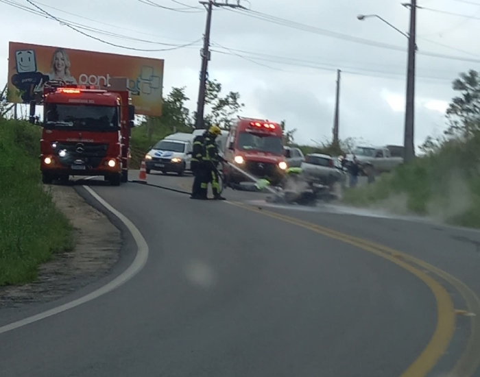 O veículo colidiu contra um VW Gol na rodovia e pegou fogo. O Corpo de Bombeiros foi acionado e fez o combate às chamas no local. O condutor da motocicleta com placas de São José, um homem de 53 anos, sofreu ferimentos e foi conduzido ao hospital de Imaruí.