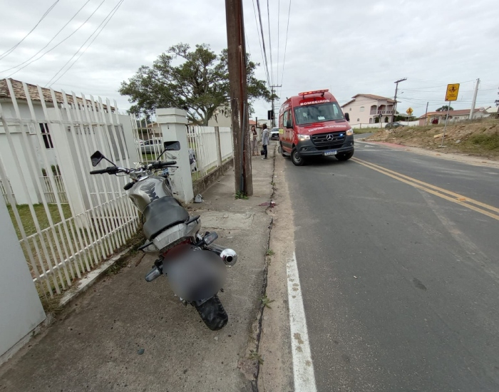 Os Bombeiros Voluntários foram acionados para atender a ocorrência. Ao chegar no local, a guarnição constatou que o motociclista colidiu o veículo contra um poste e estava caído na via apresentando edema e hemorragia em face, relatando dor na cervical e tórax.