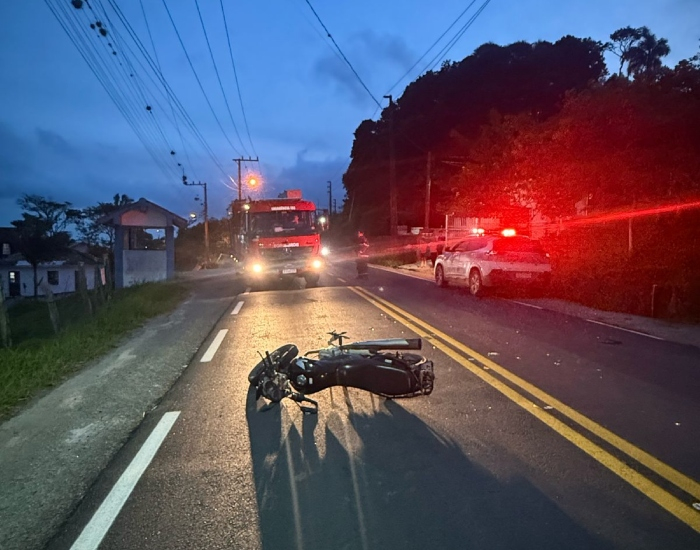 CBMSC/Divulgação/Folha Regional Um motociclista sofreu ferimentos e suspeita de fratura ao se envolver em um acidente de trânsito na noite deste sábado, dia 12, na SC-437, na cidade de Imaruí.